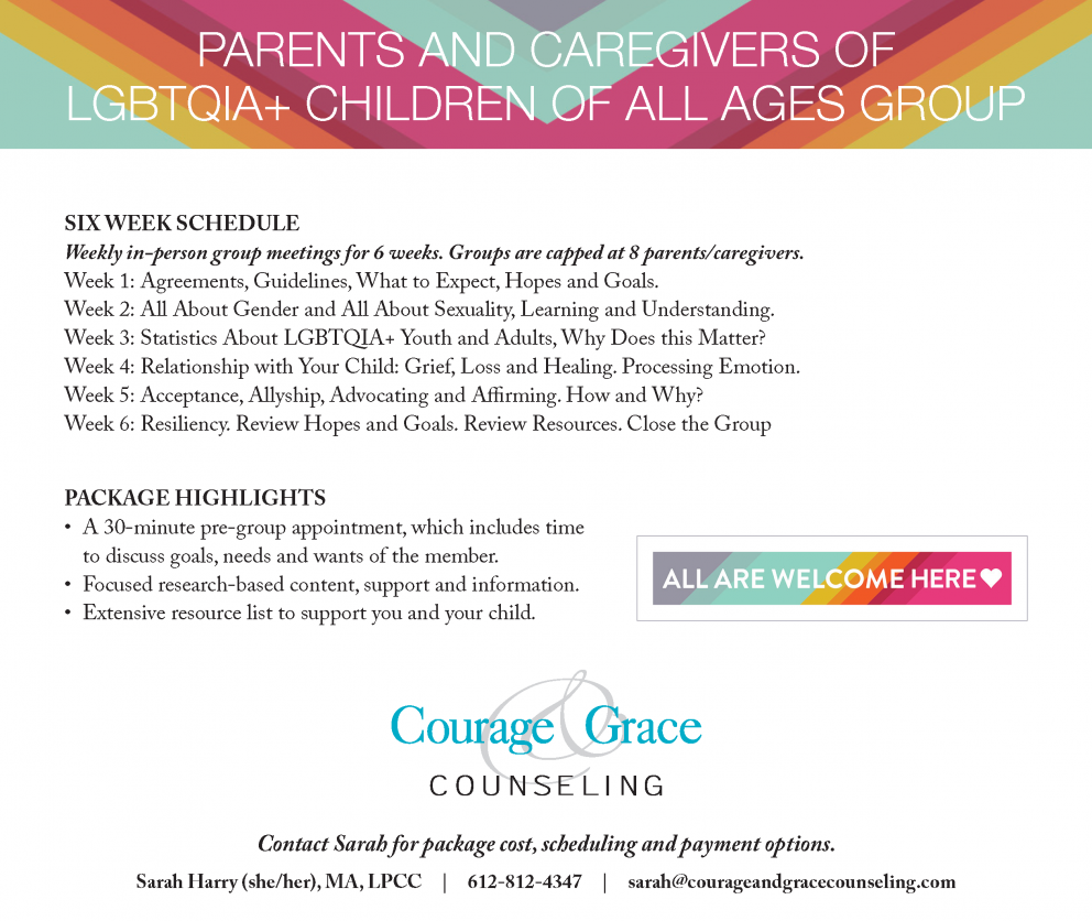 If you are the parent or caregiver of a child who is LGBTQIA+ you may be confused, lost, feeling alone and/or unsure of how to support your child. This group is designed to be a safe place to learn, process, explore grief and healing, and be supported by a professional while connecting with other parents. Click on doc image to download a printable PDF.